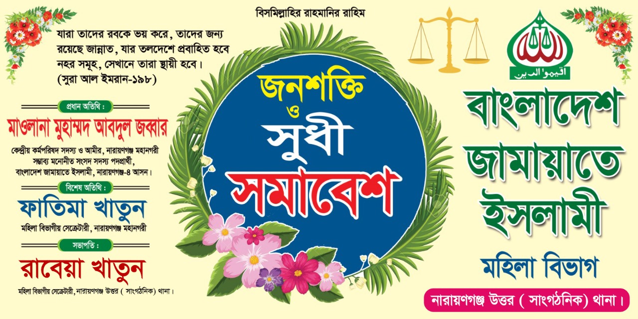 তিনি গতকাল ২৬ জুলাই শনিবার বিকেলে শহীদ তিতুমীর একাডেমী মিলনায়তনে নারায়ণগঞ্জ উত্তর থানা মহিলা বিভাগের উদ্যোগে এক জনশক্তি ও সূধী নিয়ে সমাবেশে প্রধান অতিথির বক্তব্যে এসব কথা বলেন।