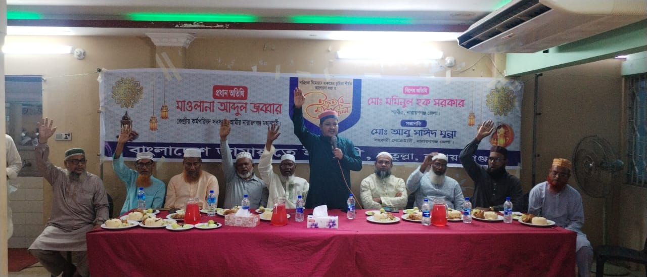 জেলা সহকারী সেক্রেটারি আবু সাঈদ মুন্নার সভাপতিত্বে উক্ত অনুষ্ঠানে আরো উপস্থিত ছিলেন জেলা প্রকাশনা সম্পাদক মজিবর রহমান মিয়াজী, জেলা অর্থ সম্পাদক মাওলানা আবদুুল মজিদ, জেলা ওলামা পরিষদের সম্পাদক মুফতি জাহাঙ্গীর আলম, ফতুল্লা দক্ষিন থানা আমীর মাওলানা নাছির উদ্দিন সরকার, পশ্চিম থানা আমীর নুরুল হক, উত্তর থানা আমীর আবুল কাসেম, থানার সকল সেক্রেটারি ও শতাধিক সুধী সহ অন্যন্য নেতৃবৃন্দ উপস্থিত ছিলেন।
