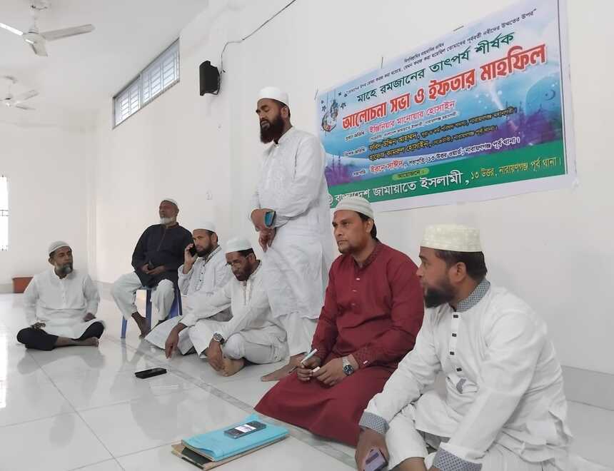 বাংলাদেশ জামায়াতে ইসলামী, নারায়ণগঞ্জ মহানগরী শাখার পূর্ব থানার ১৩ নং উত্তর সাংগঠনিক ওয়ার্ডের উদ্যোগে মাহে রমজানের তাৎপর্য শীর্ষক আলোচনা সভা ও ইফতার মাহফিল অনুষ্ঠিত হয়। ওয়ার্ড সভাপতি ইবনে সাঈদের সভাপতিত্বে উক্ত ইফতার মাহফিলে প্রধান অতিথি হিসেবে উপস্থিত ছিলেন বাংলাদেশ জামায়াতে ইসলামী, নারায়ণগঞ্জ মহানগরী শাখার সেক্রেটারী ইঞ্জিনিয়ার মানোয়ার হোসাইন। এছাড়া বিশেষ অতিথি আরো উপস্থিত ছিলেন পূর্ব থানার সাবেক আমীর বিশিষ্ট শিক্ষাবিদ ও মহানগরীর কর্মপরিষদ সদস্য ফরীদ উদ্দীন, মহানগরীর মজলিসে শূরার সদস্য ও থানা সেক্রেটারী হাফেজ মাওলানা কামরুল হোসাইন, থানার বায়তুলমাল সম্পাদক আক্তার হোসাইন, থানার অফিস সম্পাদক শামসুল ইসলাম ওয়ার্ডের বিভিন্ন পর্যায়ের নেতৃবৃন্দ।