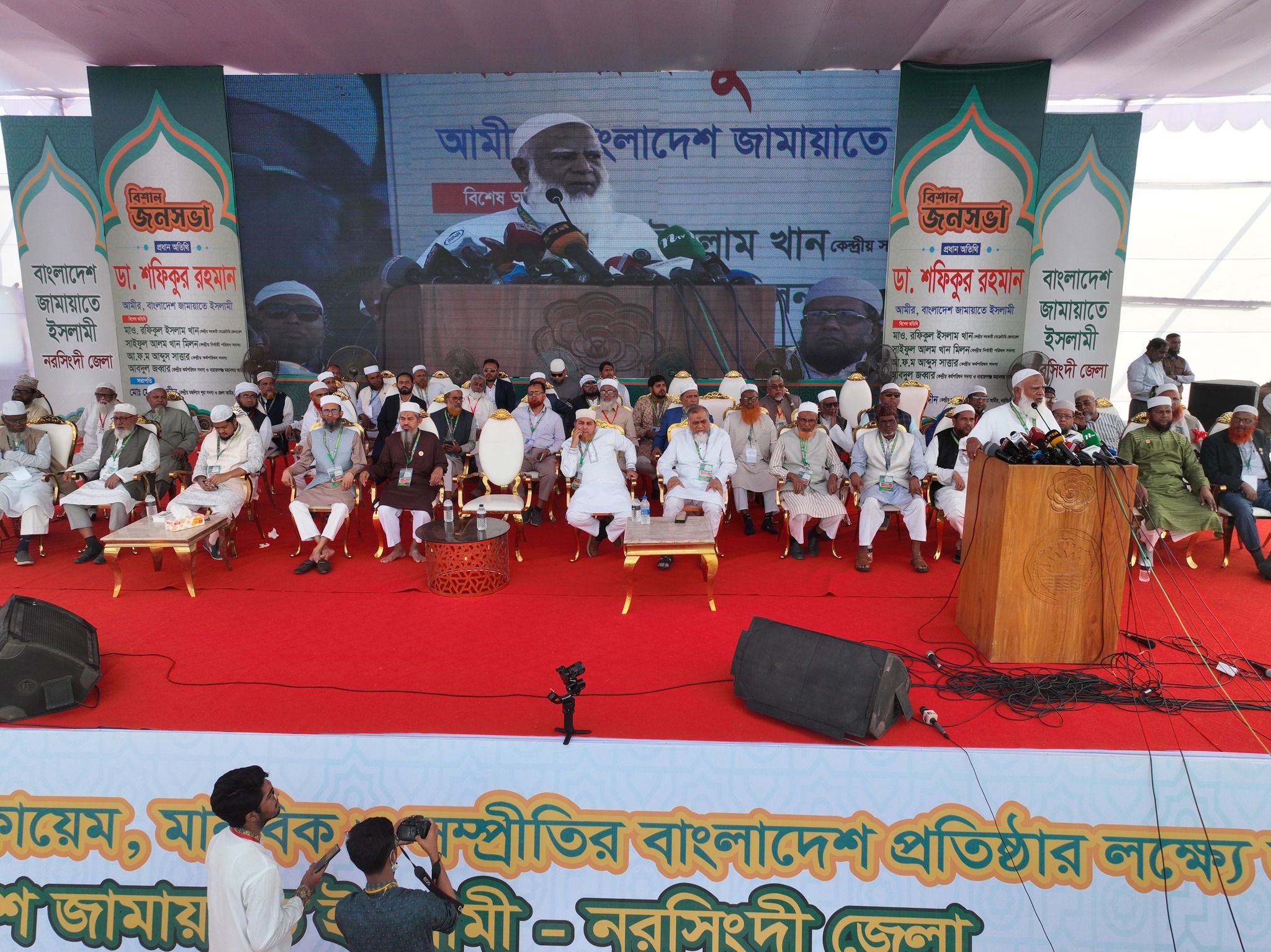 আজ জুমাবার বিকেলে নরসিংদী শহরের সাটিরপাড়া কালী কুমার ইনস্টিটিউশন স্কুল এন্ড কলেজ মাঠে নরসিংদী জেলা জামায়াত আয়োজিত এক বিশাল জনসভায় প্রধান অতিথির বক্তব্যে তিনি এসব কথা বলেন।