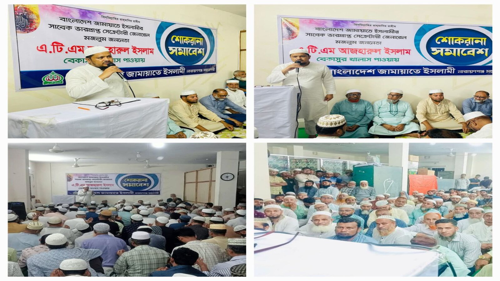বাংলাদেশ জামাতে ইসলামী সাবেক ভারপ্রাপ্ত সেক্রেটারি জেনারেল কারা নির্যাতিত মজলুম জননেতা এ টি এম আজাহারুল ইসলামের বেকসুর খালাস হওয়ায় ২৯মে বৃহস্পতিবার সন্ধায় মুহিত ফাউন্ডেশন মিলনায়তনে সিদ্ধিরগঞ্জ জামায়েত ইসলামীর পক্ষ থেকে শোকরানা সমাবেশ অনুষ্ঠিত হয়েছে।