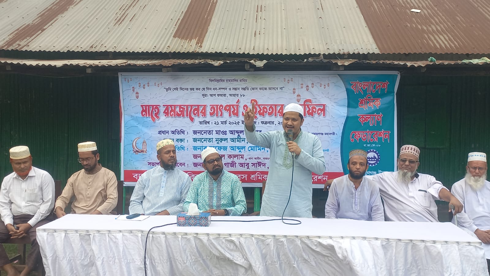 নারায়ণগঞ্জ উত্তর থানা শ্রমিক কল্যাণ ফেডারেশনের সভাপতি মাওলানা গাজী আবু সাঈদের সভাপতিত্বে অনুষ্ঠানে আরো উপস্থিত ছিলেন , মহানগর শ্রমিক কল্যাণ ফেডারেশন এর সহ সভাপতি মুন্সি আব্দুল্লাহ ফাইসুল, জামায়াতের থানা সেক্রেটারি রুহুল আমিন, মো নাদিম, মো জসিম হোসেন প্রমূখ।