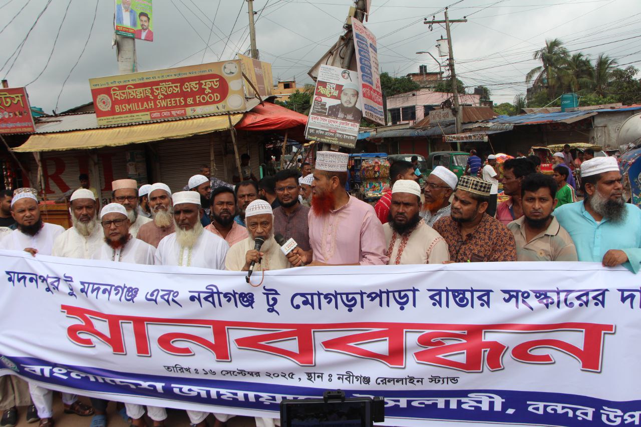 - মদনপুর,মদনগঞ্জ রাস্তাটি সংস্কারের দাবিতে মানববন্ধন অনুষ্ঠিত