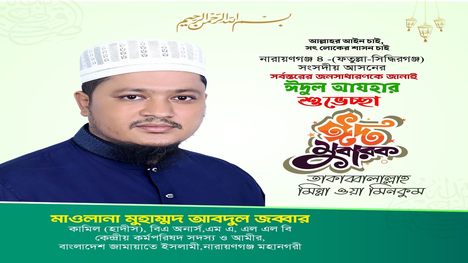 পবিত্র ঈদুল আজহা উপলক্ষে নারায়ণগঞ্জ ০৪ ফতুল্লা-সিদ্ধিরগঞ্জ আসনের এমপি প্রার্থী মুহাম্মদ আবদুুল জব্বার এর পক্ষ থেকে ঈদ মুবারক ও শুভেচ্ছা